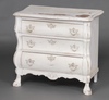 | 41 | A French style white painted oak commode fitted 3 drawers, raised on cabriole supports 68cm h x 72cm w x 41cm d | 30-40 |