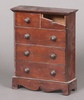 | 61 | A 19th Century mahogany apprentice chest of 2 short and 3 long drawers with brass handles, raised on bracket feet 39cm h x 30cm w x 11cm d (section of timber missing to top right short drawer) | 40-60 |