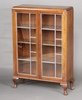 | 62 | A 1930's oak display cabinet fitted shelves enclosed by lead glazed panelled doors, raised on cabriole supports 109cm h x 75cm w x 25cm d (water and contact marks in places) | 30-40 |