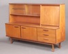 | 106 | A mid-century teak sideboard, the raised back fitted a cocktail unit, display cabinet enclosed by glazed panelled doors above a recess, the base fitted a cupboard enclosed by panelled doors, flanked by 3 drawers 123cm h x 184cm w x 46cm d (veneers missing in places) | 30-40 |