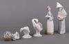 | 182 | A Lladro figure of a standing girl with chicken the base marked A99 19cm, ditto girl with pig B-26 17cm, 2 Lladro figures of geese marked 13 and 51 and duck with ducklings 4895 4cm | 20-30 |