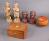 | 186 | A Victorian rectangular mahogany trinket box 13h x 24w x 16d, a turned wooden bowl and cover, a pair of carved African portrait busts of gentleman, two gilt plastic figures of cherubs | 30-40 |