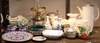 | 183 | A 1930's fifty one piece Homeleigh floral pattern tea/dinner service comprising two shallow lidded turreens and covers (cracked), six dinner plates (3 cracked), 6 side plates (2 cracked), 6 tea plates, tea pot, preserve jar and cover (some crazing), cream jug, sugar bowl, six egg cups, a rectangular sandwich plate (cracked), 6 square sandwich plates (1 cracked), six cups and saucers (3 saucers cracked), a shallow sauce boat (cracked and chipped) and a teapot stand (cracked) together with a twelve piece Ivory Old Eaton dinner service comprising 3 graduated meat plates (2 cracked), a tureen and cover (cracked), a pottery jug, three dinner plates (cracked), 2 twin handled butter plates and two circular plates (cracked) | 30-40 |