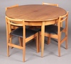 | 190 | A mid-century teak dining suite comprising circular extending dining table raised on turned supports 72cm h x 110cm diam. and a set of 4 ladder back dining chairs | 30-50 |